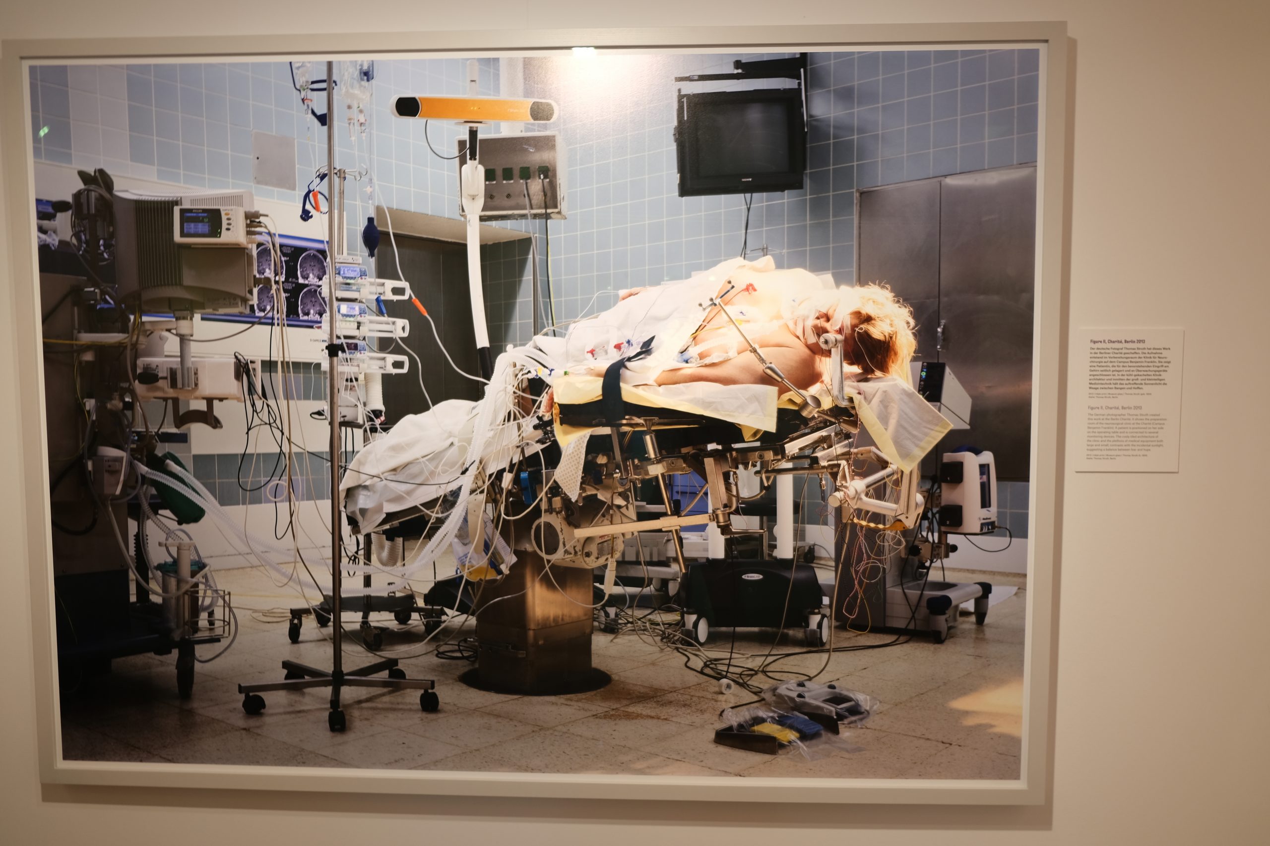 Der deutsche Fotograf Thomas Struth hat dieses Werk in der Berliner Charité geschaffen. Die Aufnahme entstand im Vorbereitungsraum der Klinik für Neuro-chirurgie auf dem Campus Benjamin Franklin. Sie zeigt eine Patientin, die für den bevorstehenden Eingriff am Gehirn seitlich gelagert und an Überwachungsgeräte angeschlossen ist. In der kühl-gekachelten Klinik-architektur und inmitten der groß- und kleinteiligen Medizintechnik hält das auftreffende Sonnenlicht die Waage zwischen Bangen und Hoffen.