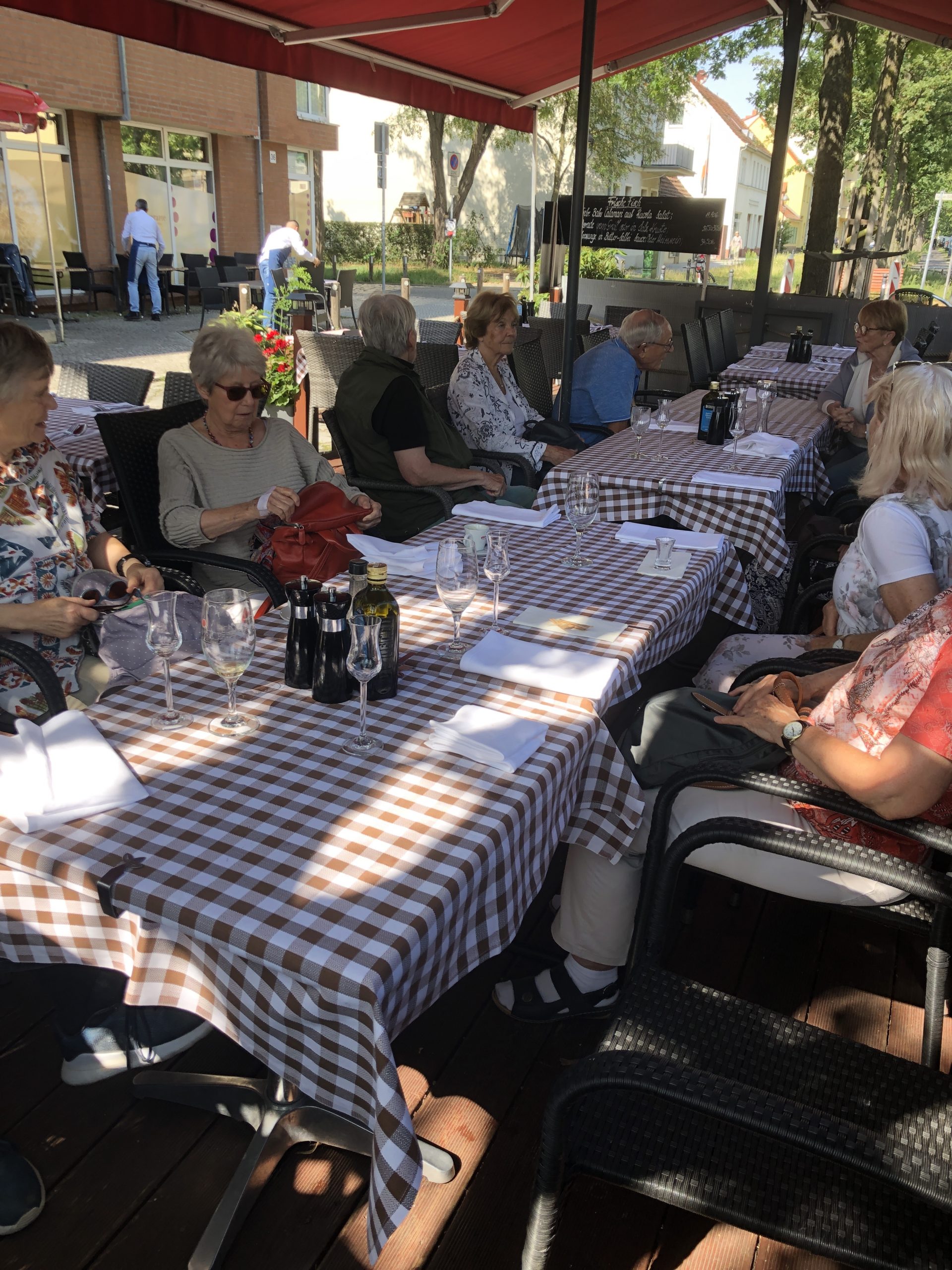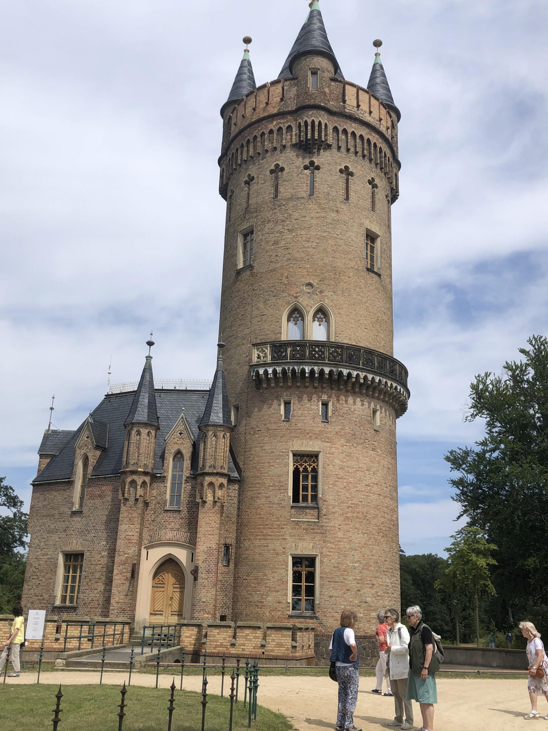 Ein kleiner Zwischensnack im Café Wartmann ließ uns erst einmal auftanken. Weiter ging es vorbei am Dampfmaschinenhaus durch die riesige Anlage zum Schloss – was leider immer noch renoviert wird- durch den Park. Ein herrlicher Blick auf die Glienicker Brücke und die vornehmen Villen in Potsdam rundete den Teil ab. Vorbei am Matrosenhaus ging es zum Flatow-Turm. Das hat Fürst Pückler alles schön anlegen lassen. Leider war auch dieser Turm nur am Wochenende offen. So ging der Rundgang weiter nach Babelsberg, wo wir in einer Nebenstraße ein gemütliches Restaurant „Al Dente“ zum Mittagsmahl fanden. Hier wurde gut gespeist um dann den Rückweg zum S-Bahnhof zu bestreiten. Dank des guten Wetters wieder ein rundum schöner Tag.