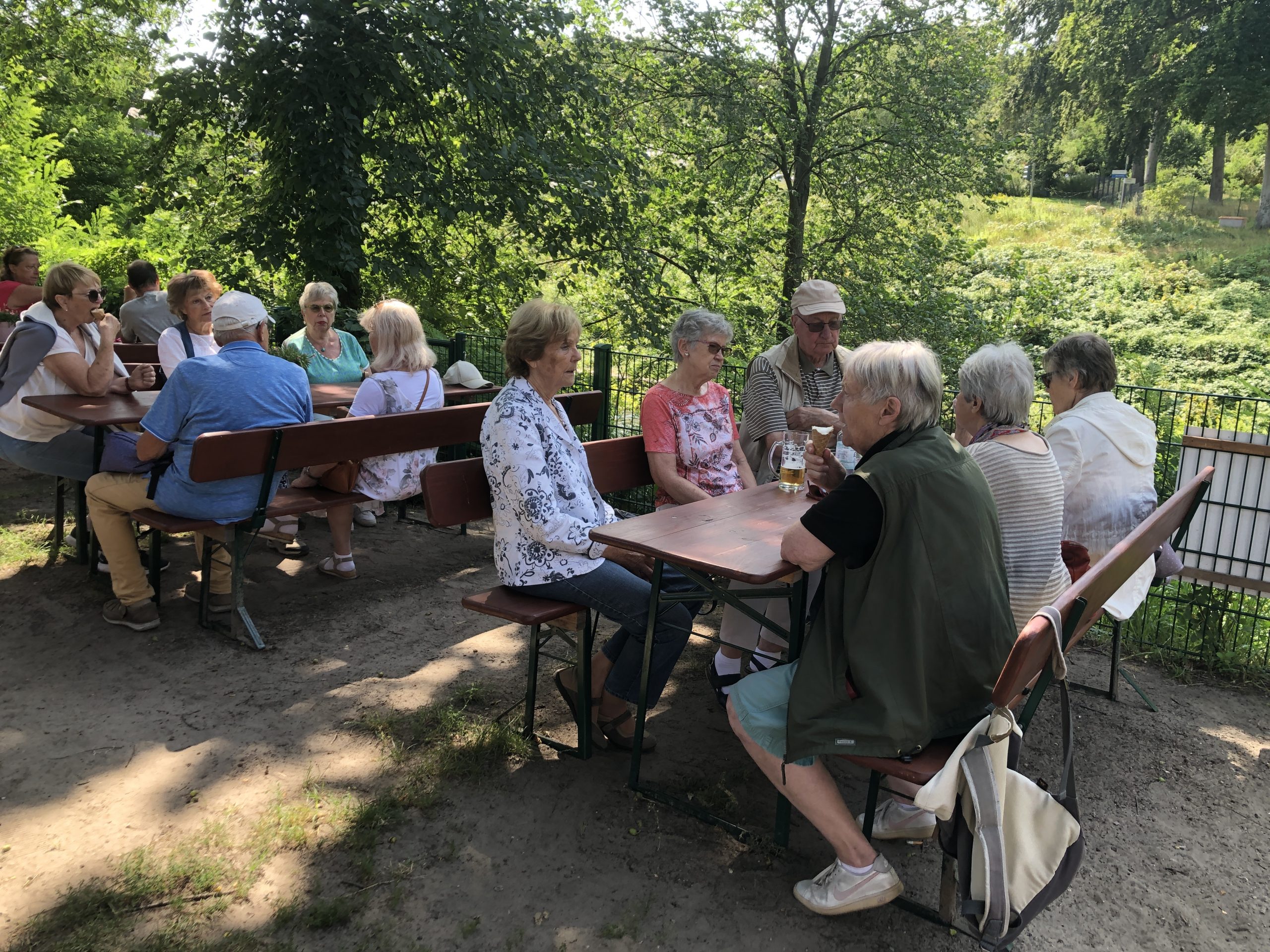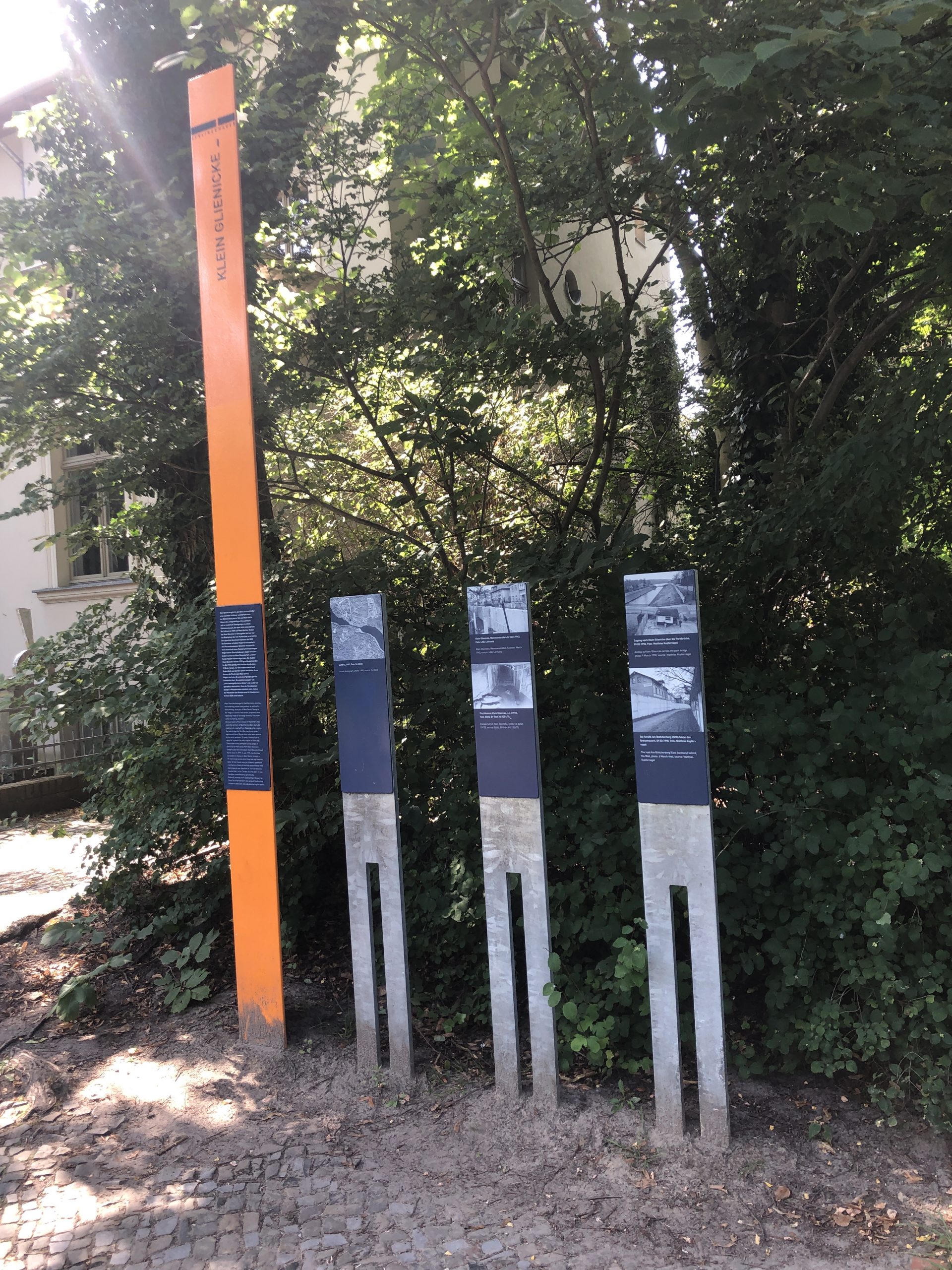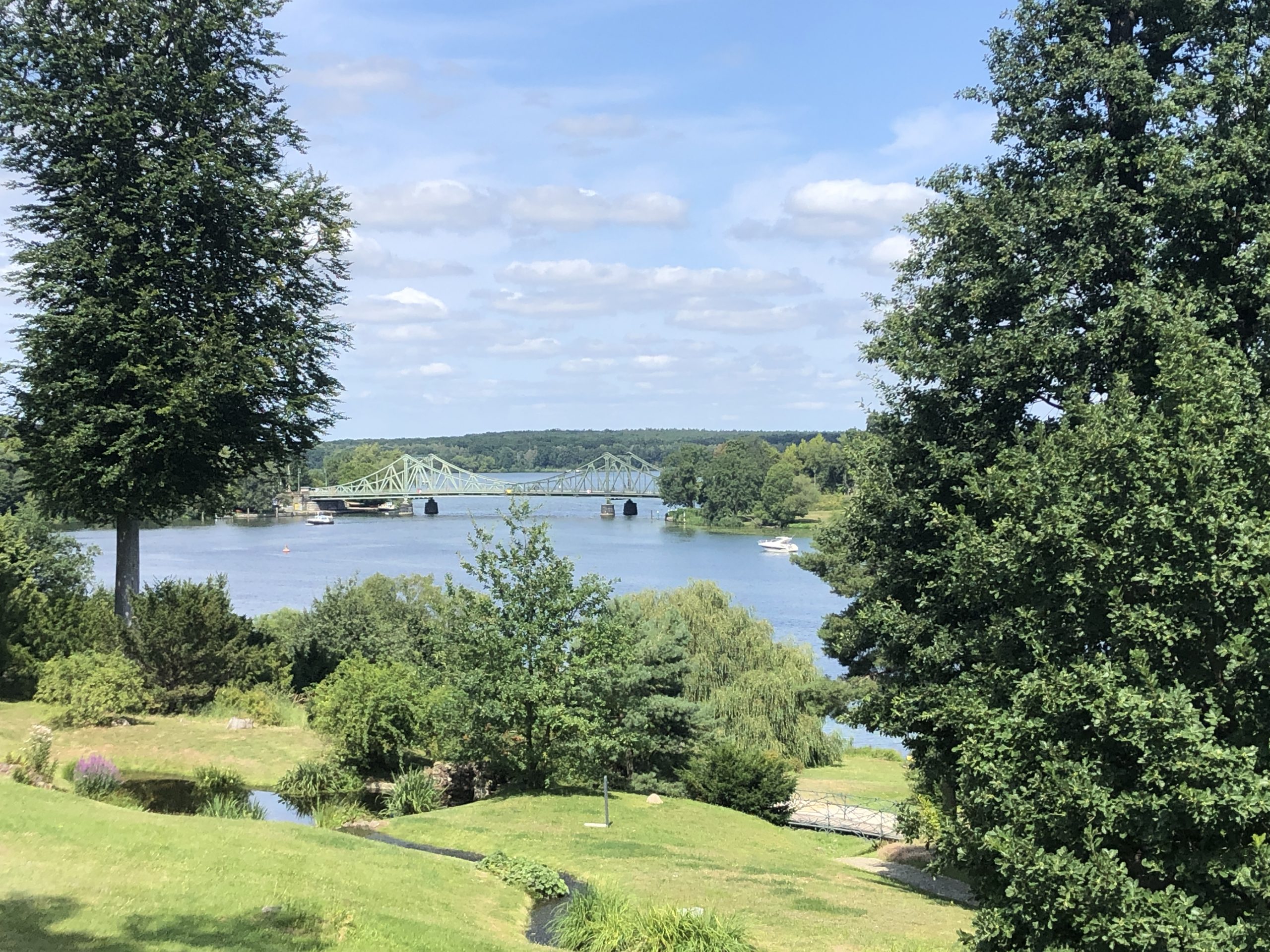 Auch unser Ausflug am  25.07.2024 zum Besuch des  Parks des Schlosses Babelsberg war leider mit kleinen Hindernissen gespickt. Der Bus, der uns von Wannsee zum Schloß Glienicke bringen sollte, war 2 Minuten zu früh abgefahren, sodass wir 40 Minuten warten mussten. Zuerst passierten wir die Gedenkstelen in Klein-Glienicke, die uns an die Teilung Deutschlands erinnerten zur Brücke zum Park.