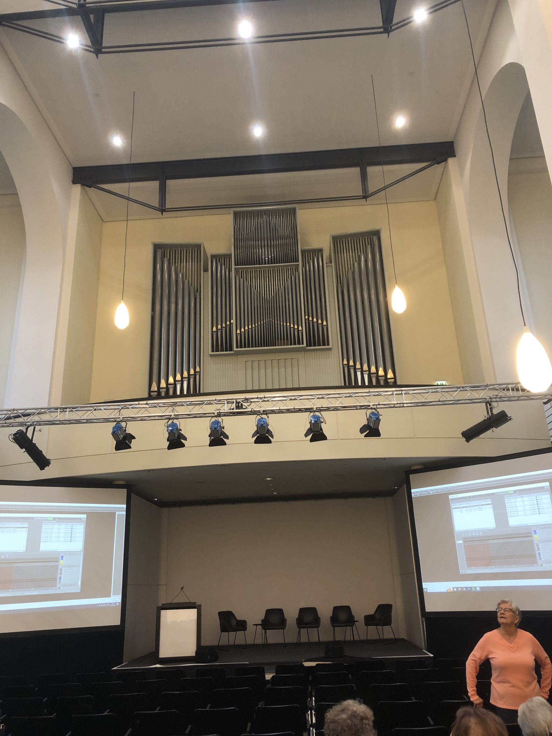 Die Auferstehungskirche, die einen modernen Anbau für Gottesdienst- und Veranstaltungszwecke bekommen hat, erstaunte uns dann doch. Eine riesige Altarwand mit einem versenkbaren Altar und einem überdimensionalen Wandrelief und einer Euler-Orgel ist für Veranstaltungen in kurzer Zeit umbaubar. So kann die Kirche mehrfach genutzt werden. Eine Winterkirche für Andachten und kleinere Gottesdienste wurde nach dem Krieg als erstes wieder aufgebaut. Bemerkenswert war der Hinweis der Führerin, dass die alte eigentliche Taufschale nach den Wiederaufbauarbeiten plötzlich verschwunden war. Ein fleißiger Hauswart fand die metallene Taufschale bei Aufräumarbeiten unter dem Dach zufällig wieder. So kann sie wieder genutzt werden. (s. Bild)