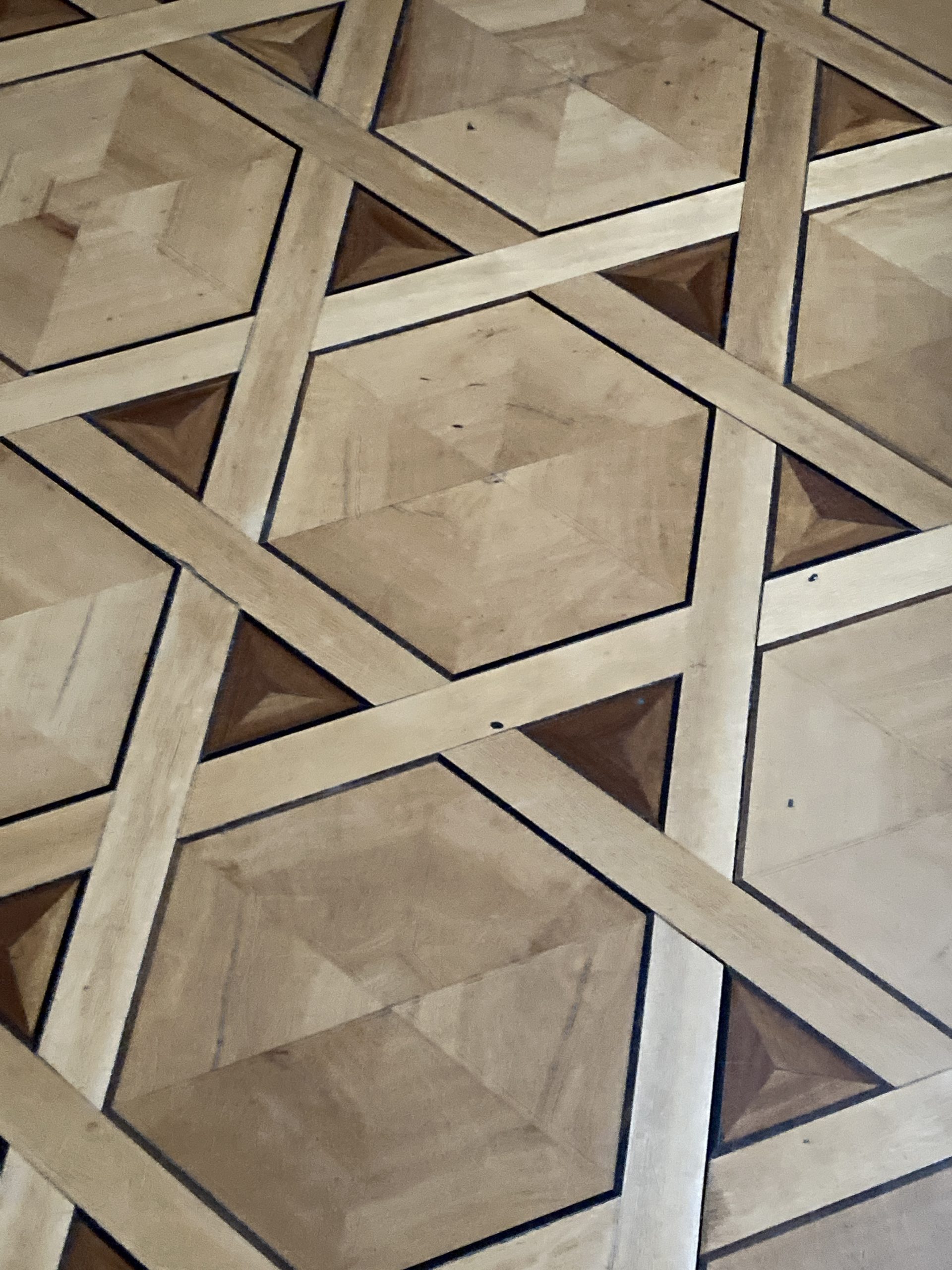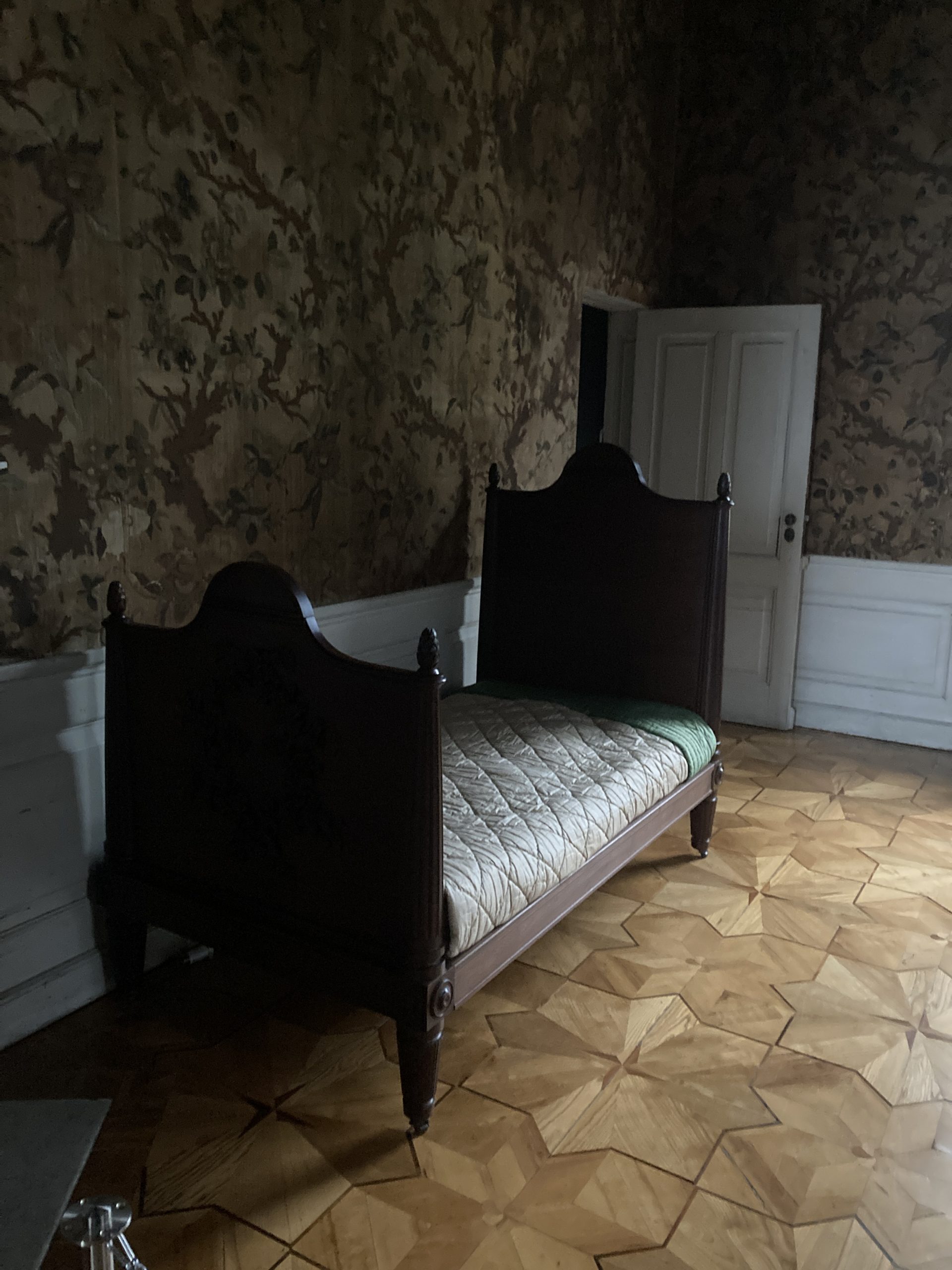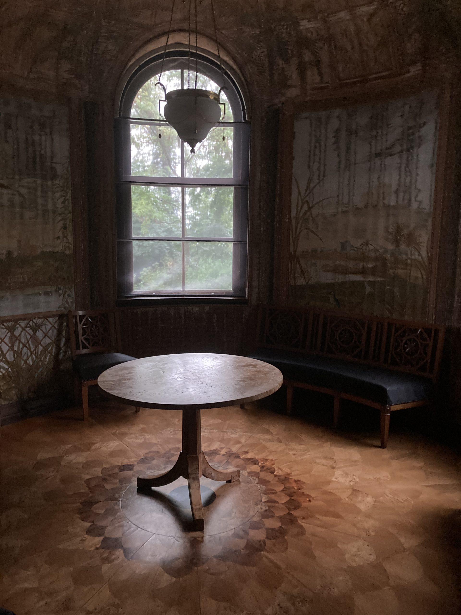 Zwei nette Damen führten uns dann durch das Schlößchen und erläuterten uns wie und warum es errichtet wurde. Da es kein elektrisches Licht im Schloß gibt, mussten sich unsere Augen an das ‚Halbdunkel erst einmal gewöhnen. Unsere eigenen Smartphones dienten als Lampen um die seit dem 18. Jht. fehlende Beleuchtung zu ersetzen. Die zwar renovierten Räume aber im Originalzustand gelassen, veranschaulichten wie man damals lebte. Besonders bemerkenswert waren die sternförmigen Intarsien des Bodens aus verschieden Gehölzarten , die im Original erhalten sind. Ein einfaches aber schönes Leben hatte das Königspaar auf der Insel.